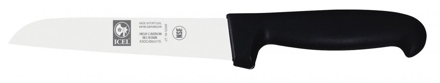 Лезвия ножей «ICEL» изготавливаются из высококачественной стали европейского производства, обогащенной добавками, молибдена и ванадия, благодаря которым ножи приобретают качество сопротивляемости механическим повреждениям и,что важно, не взаимодействуют с химическими и моющими средствами. Лезвия закаливаются по швейцарской технологии. Твердость стали ножей «ICEL» колеблется в районе 54–56 единиц по шкале «Роквелла». Заточка осуществляется вручную высококвалифицированными специалистами. Сама рукоятка изготовлена из высокотехнологичного нескользящего пластика «Proflex» со специальной антибактериальной защитой «Microban». Защита «Microban», внедрена в изделие в процессе его производства и не исчезает со временем, ведь это не покрытие на поверхности материала. защита буквально находится во всем объеме продукта, не смывается и не изнашивается. Наличие специального выступа «пяточки» на рукояти ножа. Его функция — защита руки от соскальзывания в процессе использования. Важно! Только ножи с пластиковой ручкой можно мыть в посудомоечной машине. Однако сначала их необходимо промыть проточной водой и вынуть из машины сразу после окончания цикла стирки, избежав таким образом пятен и коррозии на лезвиях. Также важно держать их отдельно от других предметов, чтобы избежать контакта, который приведет к повреждению края. Материал лезвия: нержавеющая сталь Материал рукояти: пластик Мойка в посудомоечной машине: да
