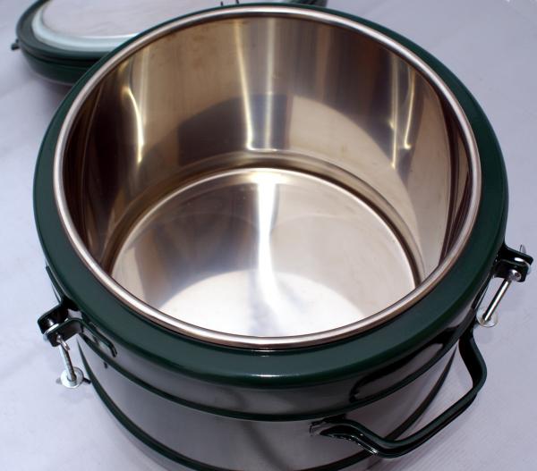 Термосы армейские для еды представляют собой цельную конструкцию, идеально подходящую для хранения и перевозки горячей или холодной пищи. Термосы армейские для горячей еды широко используются для нужд: армии, армейских магазинов, магазинов военных товаров, военных сборов, МЧС, больниц, столовых, школ, кафе, сельского хозяйства, лагерей, выездного питания, кейтеринга, туристических походов, личного пользования. Время поддержания температуры еды в термосе от 90°С до 50°С при наружной температуре 15°С – 6 часов. Размер: 380x380x340 мм. Вес: 6.820 кг Термос армейский состоит из: Стального корпуса и крышки с термопластиковым покрытием TALISMAN 30ES. Для наружного покрытия термоса используется инновационное термопластиковое покрытие. Покрытие обладает выдающимися характеристиками сопротивления ржавчине, химикатам, моющим средствам, органическим красителям и механическим повреждениям. Высокая рабочая температура – 100 градусов С, пищевой сертификат FDA: Высокие декоративные качества и долговечная защита; При стандартной толщине до 200 мкм обладает отличной износостойкостью, пластичностью и соответственно устойчивостью к скалыванию; Высокая эластичность, превосходное растекание по поверхности, включая острые кромки и сварные швы; Отсутствие проблем, существующих при традиционном окрашивании – растрескивания и отслаивания; Доказанная безопасность при контакте с пищевыми продуктами и водой; Соответствие международным требованиям RoHS и PAHS (правила на ограничение содержания вредных веществ и полициклических ароматических углеводородов). Внутренняя емкость - колба изготовлена из высококачественной нержавеющей стали (марки 304, 316), которая соответствует требованиям к гигиене и контакту с пищей. Колба из нержавеющей стали изготовлена по технологии сварки "встык", при данном методе сварки на изделии не остается зазора между материалом, в который могут попасть остатки пищи. Изоляцией у термоса служит полиэтиленовый теплоизоляционный материал Силиконовое уплотнительное кольцо . Жёсткость по Шору 65°. Выдерживает температуры свыше 100°С. Преимущества термосов армейских: - Горячая или холодная пища в течение 6 часов! - Герметичность крышки - Колба без швов из пищевого алюминия - Благодаря устойчивой форме, термоса не деформируются при транспортировке - Удобные ручки для переноски - Термостойкость и стойкость к коррозии